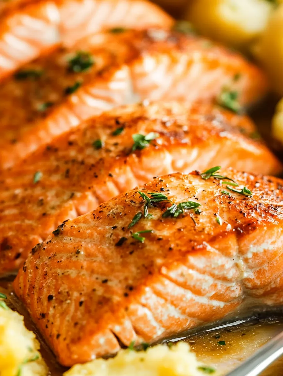Once baked, remove the salmon from the oven and let it rest for a couple of minutes. Garnish with fresh parsley and lemon slices before serving. This adds a refreshing touch and enhances the dish’s visual appeal.