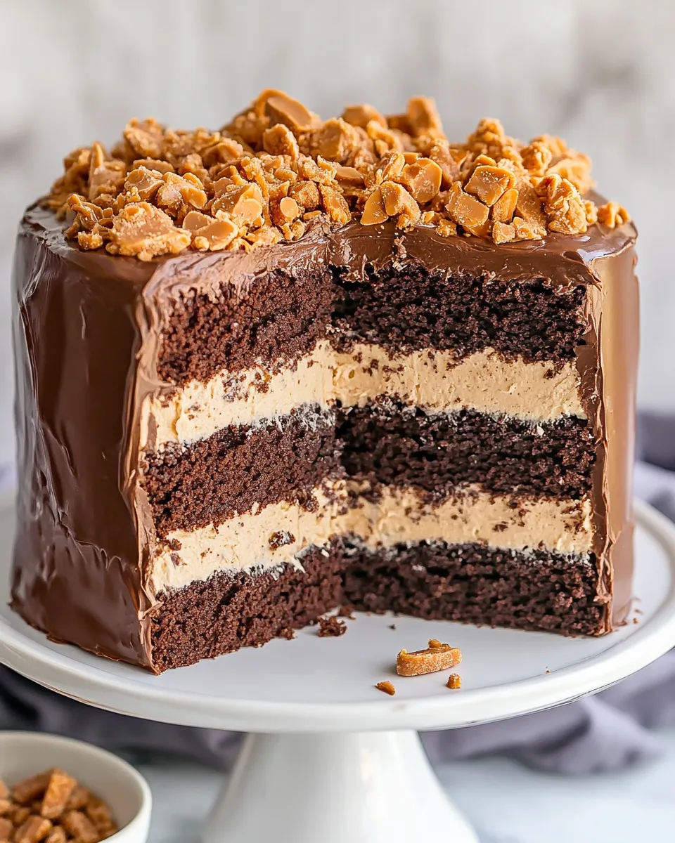 Once the cakes are completely cooled, place one layer on a serving plate. Spread half of the Butterfinger filling on top, then place the second cake layer on top. Frost the top and sides of the cake with the chocolate frosting.