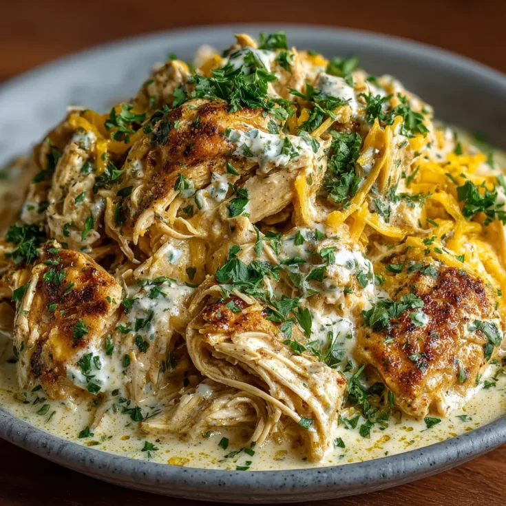 - Once cooked, shred the chicken with two forks and mix it back into the sauce. Garnish with fresh parsley or chives before serving.
