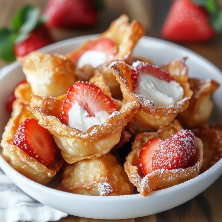 Dust the crispy wontons with powdered sugar and serve them warm with a dollop of whipped cream and fresh strawberries. Enjoy the delightful crunch and creamy filling!