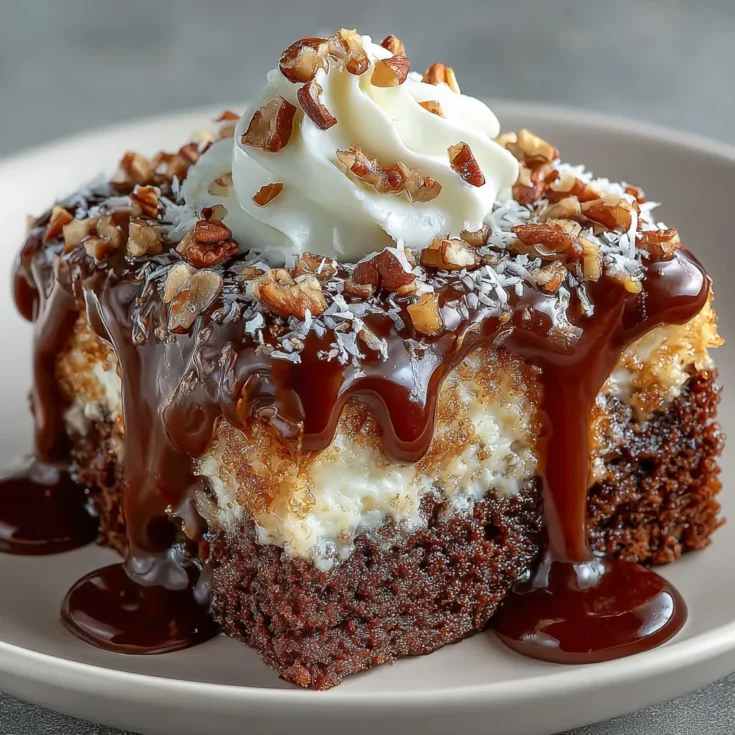 In summary, the German Chocolate Poke Cake is a delightful dessert that combines the rich flavors of chocolate with a creamy coconut-pecan frosting. Easy to make and incredibly satisfying, it’s perfect for any occasion. Try this recipe today and let us know your thoughts in the comments! Don’t forget to subscribe for more delicious updates!