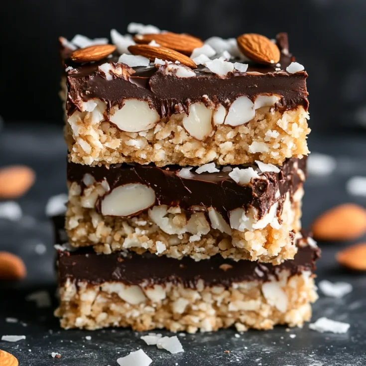 Sprinkle whole almonds and additional shredded coconut on top of the chocolate layer for added texture and flavor.