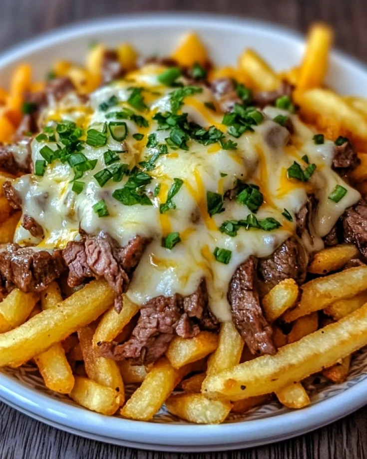 On a large serving platter, layer the crispy fries, followed by the cheesy steak mixture. Be generous—this dish is all about indulgence!