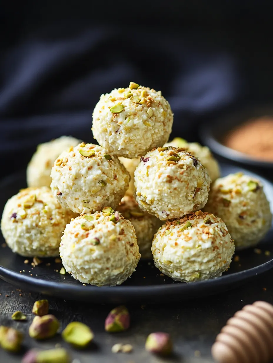 Once chilled, you can roll the bites in cocoa powder, crushed graham crackers, or leave them plain. For an extra touch, drizzle with melted dark chocolate before serving. Enjoy your Ricotta Pistachio Honey Dessert Bites as a delightful treat!