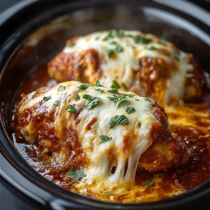 - Add to slow cooker: Place the seasoned chicken in the slow cooker. Pour marinara sauce over the chicken evenly.
