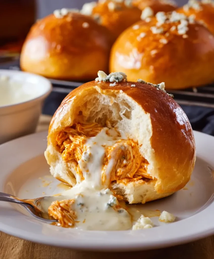 Spoon 2–3 tbsp of the buffalo chicken mixture into the center of each.- Fold and pinch the dough around the filling to seal. Place seam side down on the baking sheet.