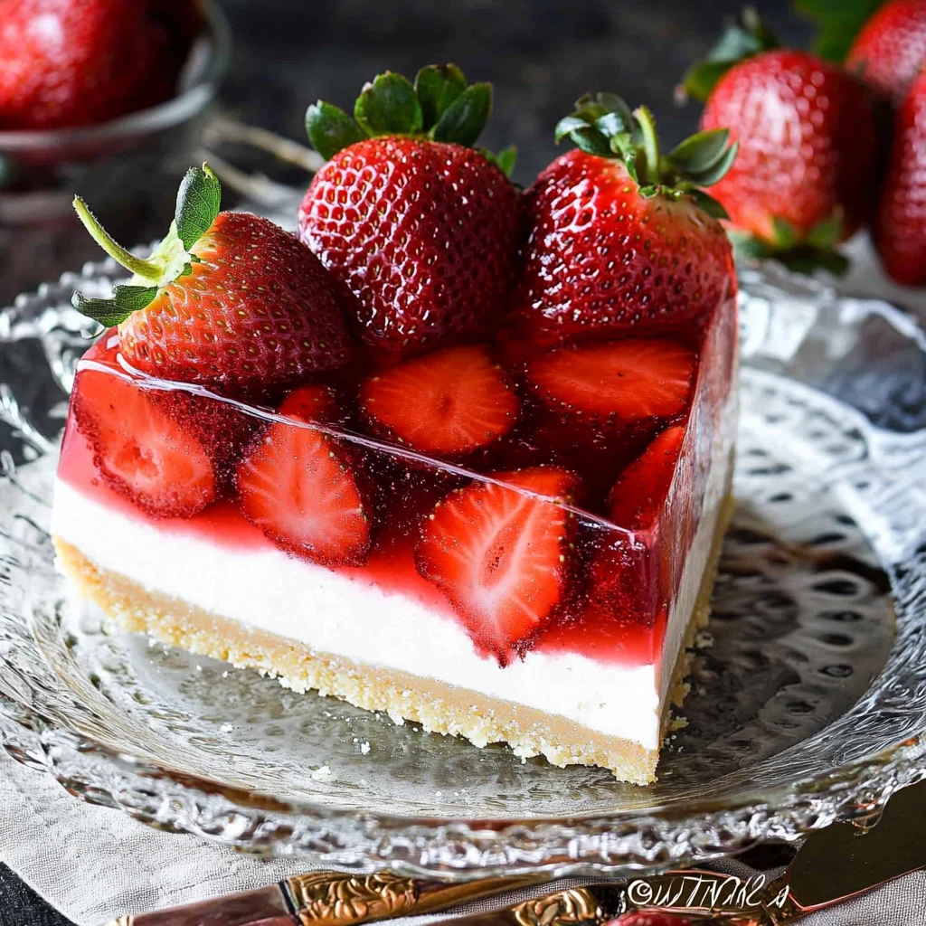 Once set, slice the Strawberry Jello Cake into squares and serve chilled. You can garnish with fresh strawberries or a drizzle of chocolate sauce for added flair.