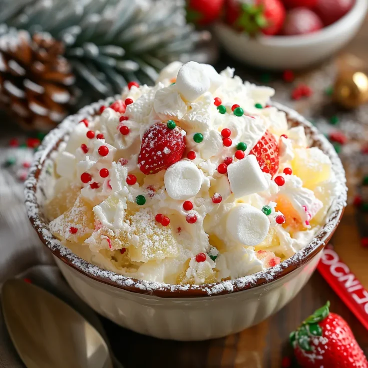 Before serving, sprinkle the top with red and green sprinkles for a festive touch. You can also add fresh fruit on top for decoration. Serve chilled and enjoy the delightful flavors of your Sweet Fluffy Christmas Fluff Dessert!